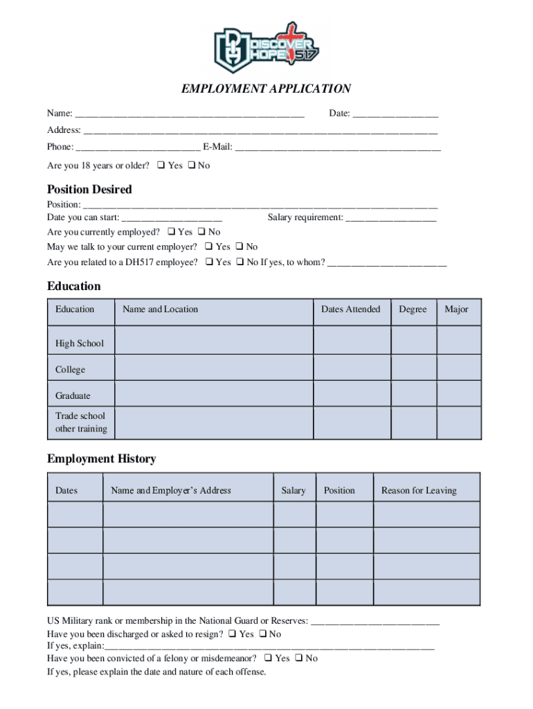 EMPLOYMENT APPLICATION Name: ___Date: ___Address: ___ Phone: ___ Email: ___ Are you 18 years or older? Yes Position Desired Position: ___ Date you can start: ___ Salary requirement: ___ Are you currently