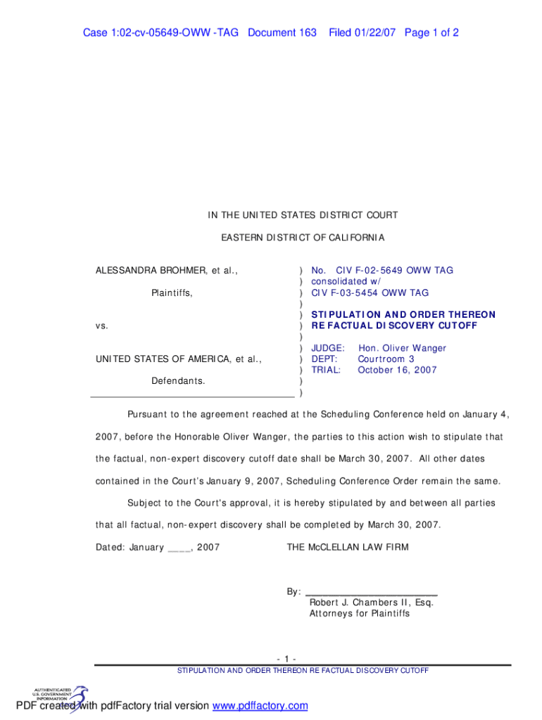 Case 1:02cv05649OWW TAG Document 163Filed 01/22/07-Page 1 of 2IN THE UNITED STATES DISTRICT COURT EASTERN DISTRICT OF CALIFORNIA ALESSANDRA BROTHER, et al.,) )))))))))))Plaintiffs, vs. UNITED STATES