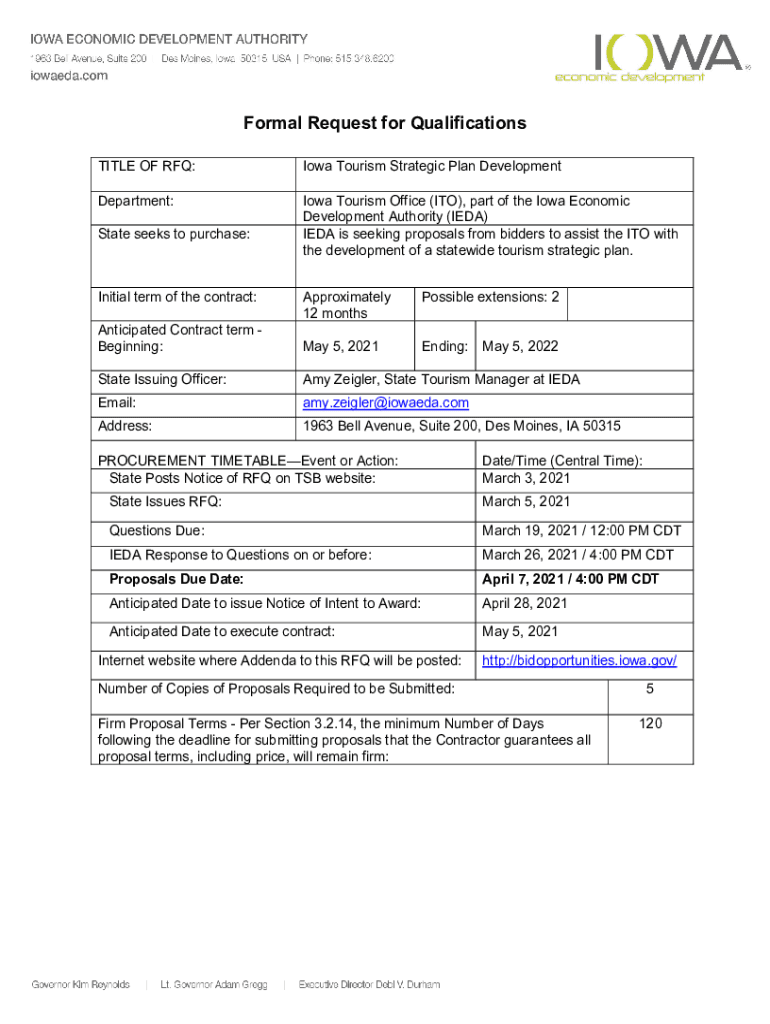 Formal Request for Qualifications TITLE OF RFQ:Iowa Tourism Strategic Plan DevelopmentDepartment:Iowa Tourism Office (ITO), part of the Iowa Economic Development Authority (IEA) IEA is seeking proposals