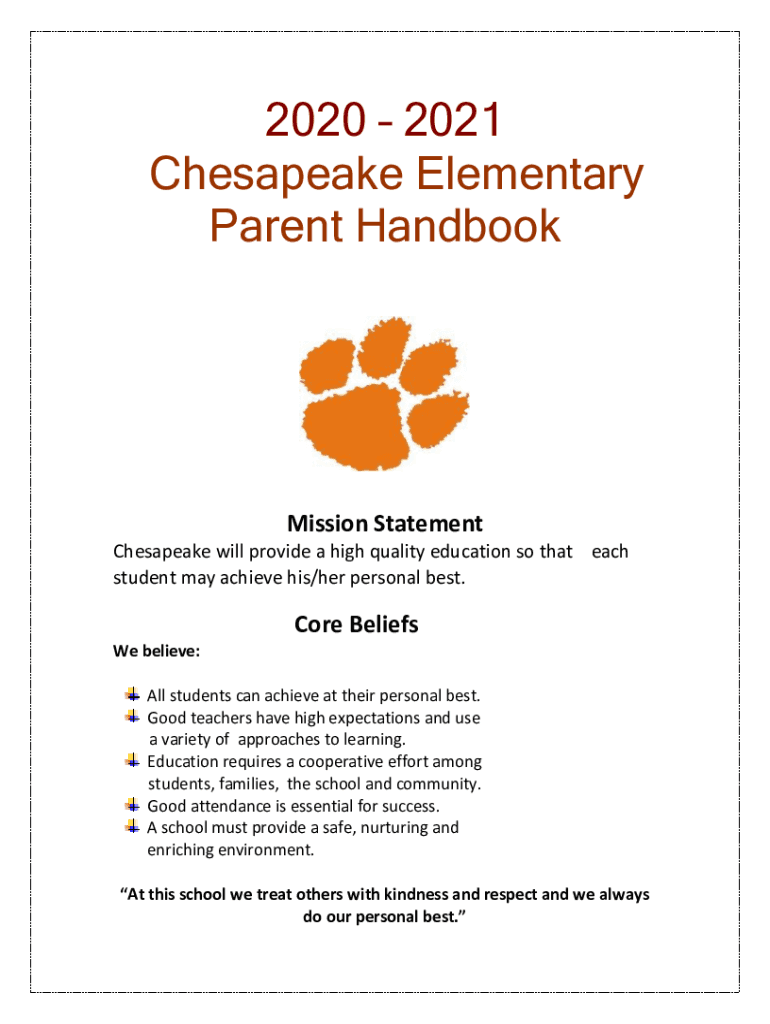 2020 2021 Chesapeake Elementary Parent HandbookMission Statement Chesapeake will provide a high quality education so that each student may achieve his/her personal best. Core Beliefs We believe: All