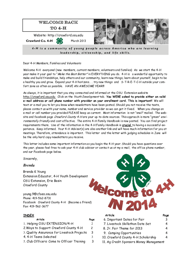 WELCOME BACK TO 4h Website: http://crawford.osu.eduCrawford Co. 4HMarch 20134H is a community of young people across America who are learning leadership, citizenship, and life skills. Dear 4H Members,
