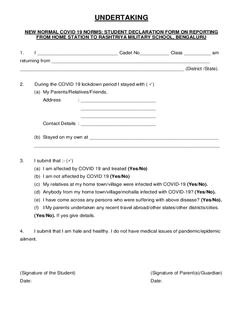 UNDERTAKING NEW NORMAL COVID-19 NORMS: STUDENT DECLARATION FORM ON REPORTING FROM HOME STATION TO ASHTRAY MILITARY SCHOOL, BENGALURU1. I ___ Cadet No___ Class ___ am I returning from ___ ___ (District