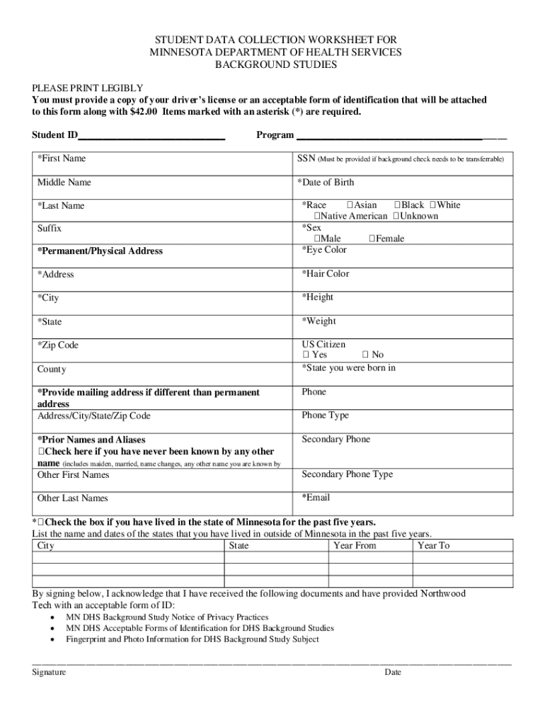 STUDENT DATA COLLECTION WORKSHEET FOR MINNESOTA DEPARTMENT OF HEALTH SERVICES BACKGROUND STUDIES PLEASE PRINT LEGIBLY You must provide a copy of your driver's license or an acceptable form of identification