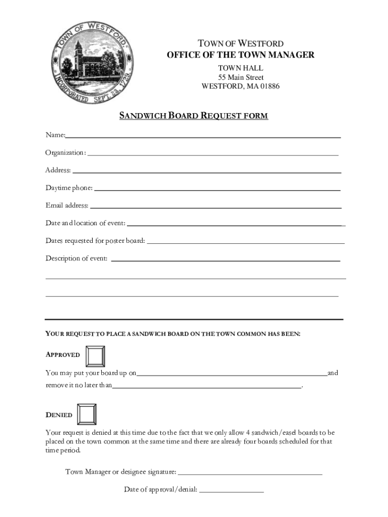 TOWN OF WESTWARD OFFICE OF THE TOWN MANAGER TOWN HALL 55 Main Street WESTWARD, MA 01886SANDWICH BOARD REQUEST FORM Name: Organization: ___ Address: Daytime phone: Email address: Date and location