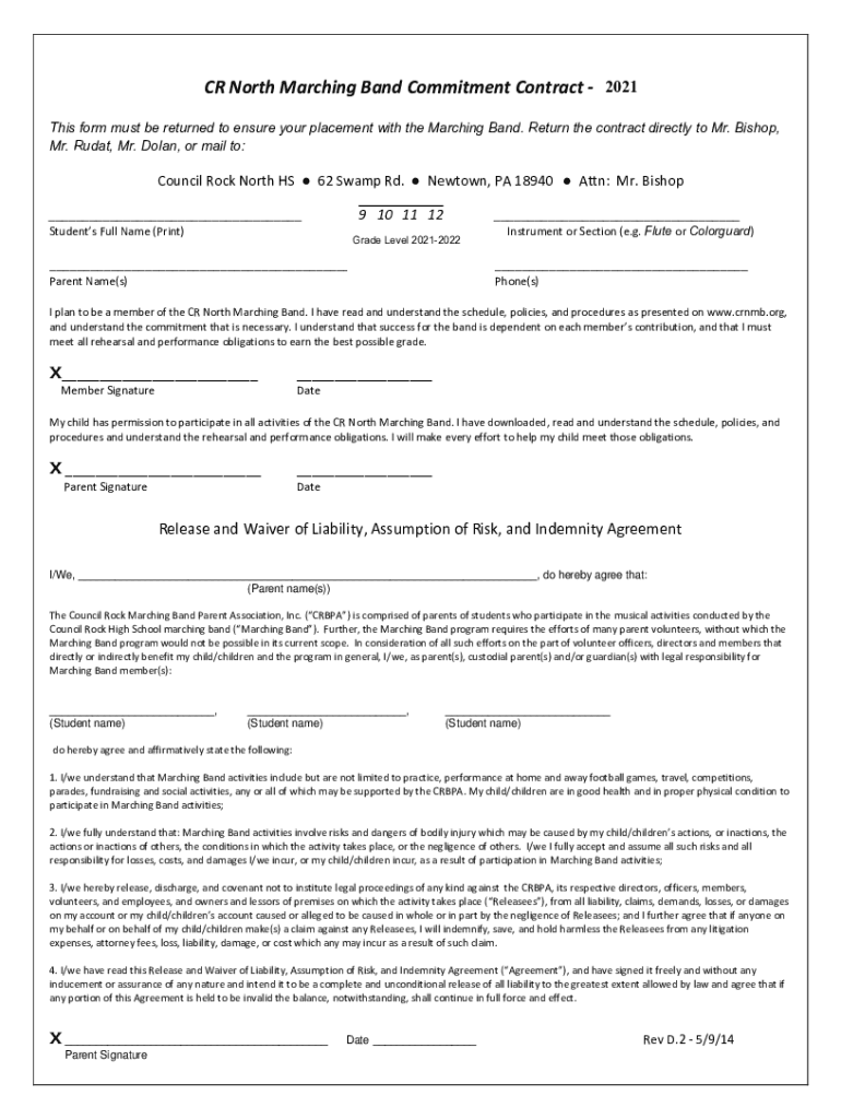 2021 CR 2016 2020 CR North Marching Band Commitment Contract 2016 your placement with This form must be returned to ensure your with the Marching Band. Band. Return the contract directly to Mr. Mr.