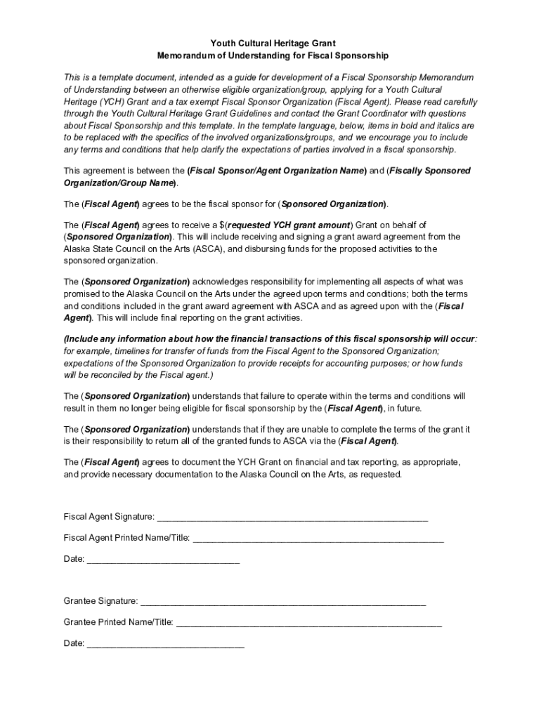 Youth Cultural Heritage Grant Memorandum of Understanding for Fiscal Sponsorship This is a template document, intended as a guide for development of a Fiscal Sponsorship Memorandum of Understanding