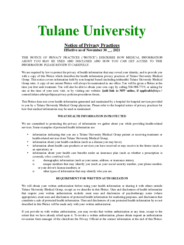 Tulane University Notice of Privacy Practices Effective as of November 30 __, 2021 THIS NOTICE OF PRIVACY PRACTICES (NOTICE) DESCRIBES HOW MEDICAL INFORMATION ABOUT YOU MAY BE USED AND DISCLOSED AND