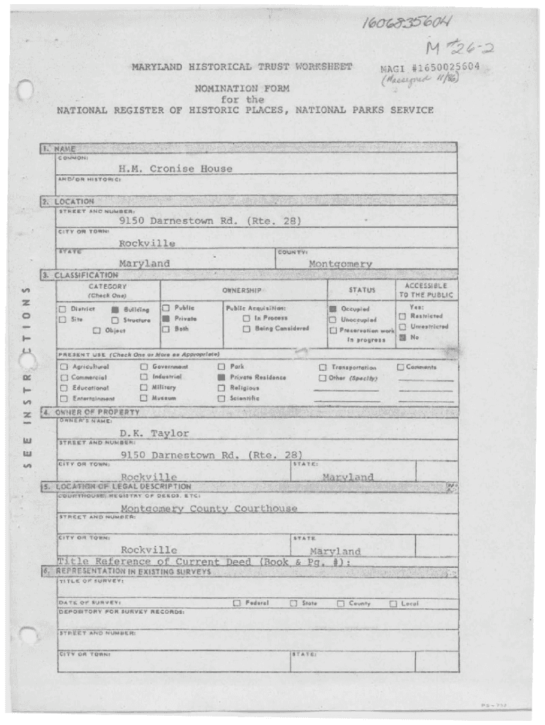 I 6.3S\'\” 6tJ/./fv1 ;2 MARYLAND HISTORICAL TRUST WORKSHEETMAGI 11650025 604(//1.4 11)NOMINATION FORM for national REGISTER OF HISTORIC PLACES, NATIONAL PAR.KS SERVICE 11...NA, E C0\”\”\'011H.