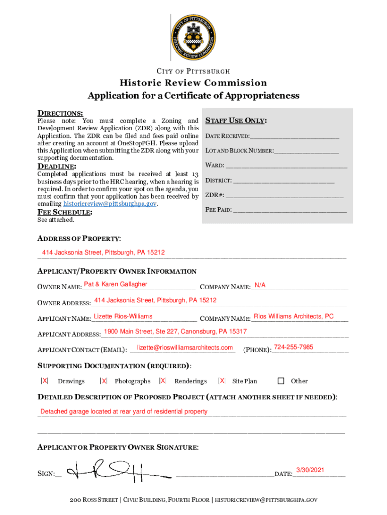 C I TYO FP I T TS B U R GH Historic Review Commission Application for a Certificate of Appropriateness DIRECTIONS: Please note: You must complete a Zoning and Development Review Application (DR) along