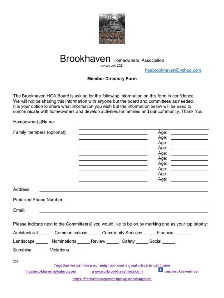 Brookhaven Homeowners Association revised July 2021hoabrookhaven@yahoo.comMember Directory Form The Brookhaven HOA Board is asking for the following information on this form in confidence. We will