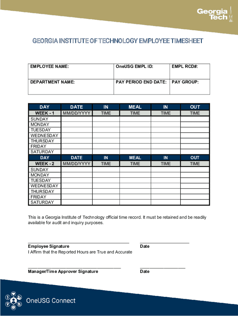 GEORGIA INSTITUTE OF TECHNOLOGY EMPLOYEE TIMESHEETEMPLOYEE NAME:One USG EMIL ID:EMIL RCD#:DEPARTMENT NAME:PAY PERIOD END DATE:PAY GROUP:WEEK 1 SUNDAY MONDAY TUESDAY WEDNESDAY THURSDAY FRIDAY SATURDAY