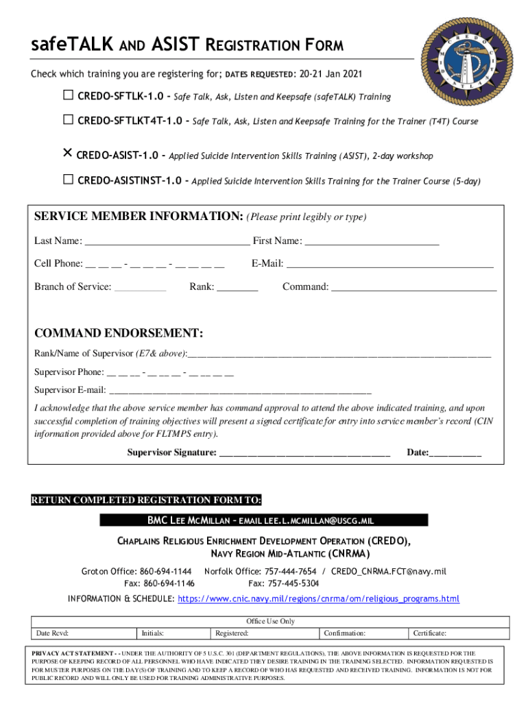 SafeTALKANDASIST REGISTRATION Recheck which training you are registering for; DATES REQUESTED: 2021 Jan 2021 CREDOSFTLK1.0 Safe Talk, Ask, Listen and Keepsake (safety) Training CREDOSFTLKT4T1.0 Safe