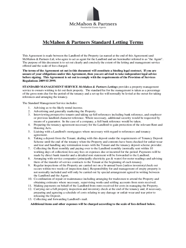 McMahon & Partners Standard Letting Terms This Agreement is made between the Landlord of the Property (as named at the end of this Agreement) and McMahon & Partners Ltd, who agree to act as agent