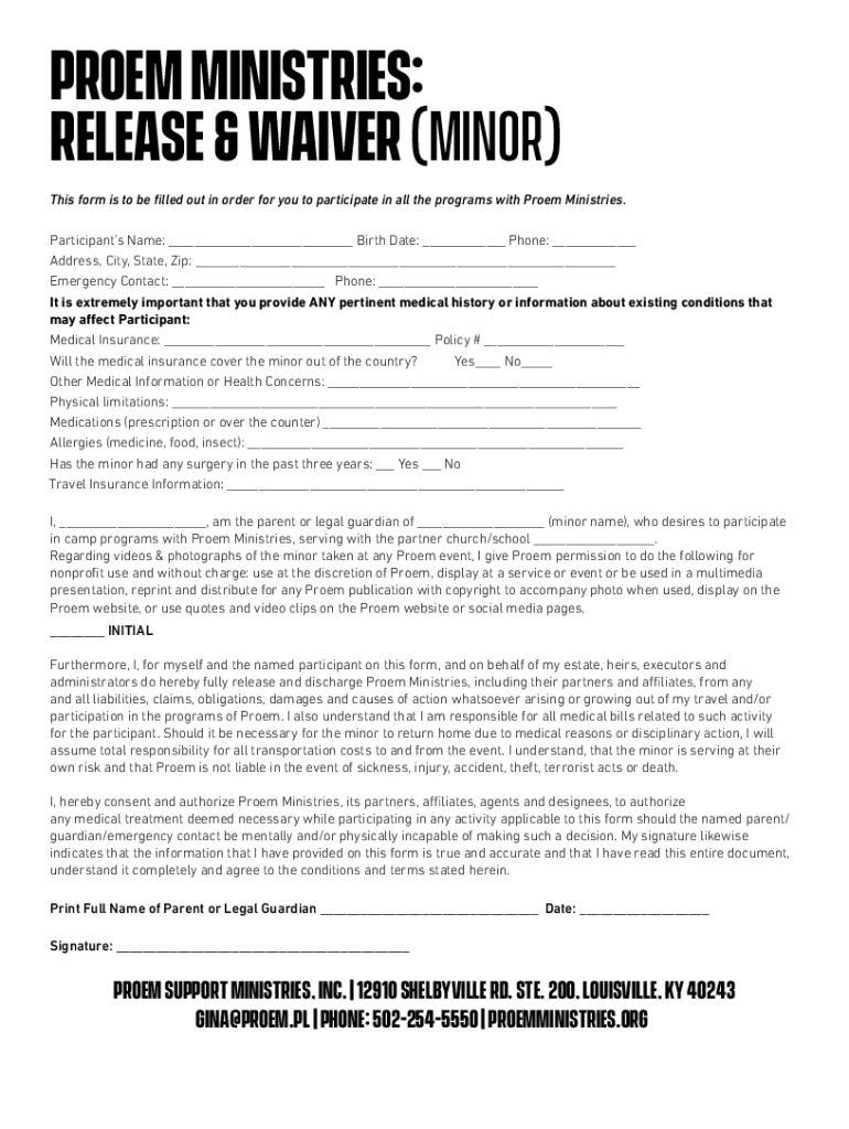 Poem Ministries: Release & Waiver (Minor) This form is to be filled out in order for you to participate in all the programs with Poem Ministries. Participants Name: ___ Birth Date: ___ Phone: ___