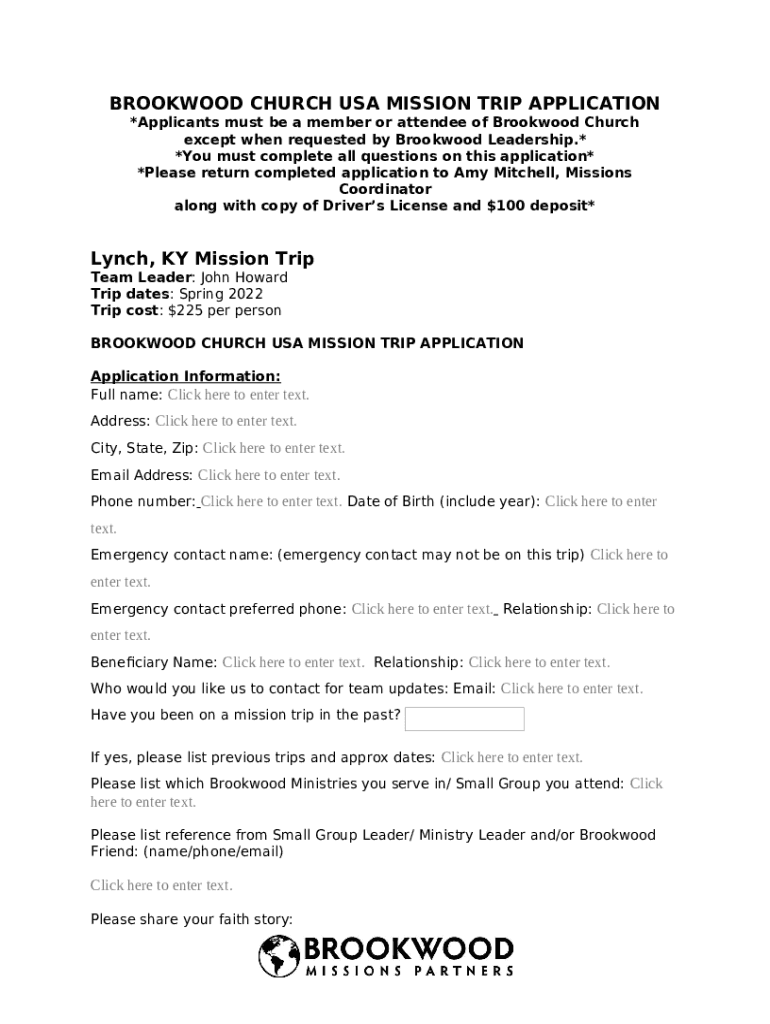 What is brookwoodchurch.org Content ExternalBROOKWOOD CHURCH USA MISSION TRIP APPLICATION Form?