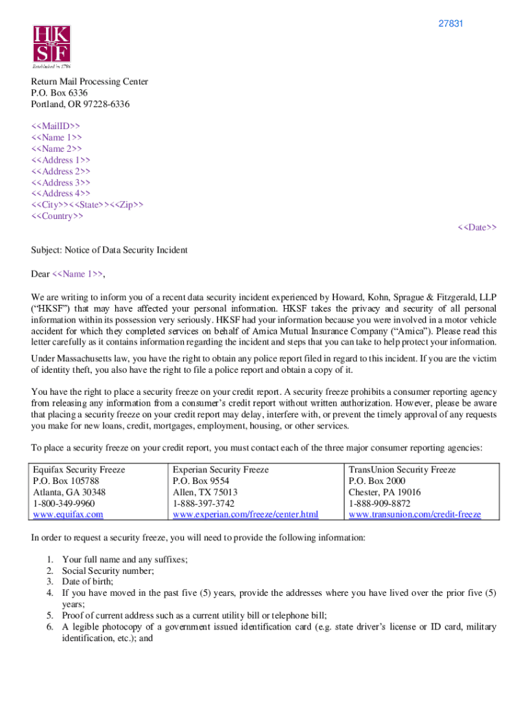 27831Return Mail Processing Center P.O. Box 6336 Portland, OR 972286336 Mailed Name 1 Name 2 Address 1 Address 2 Address 3 Address 4 CityStateZip Country Date Subject: Notice of Data Security Incident