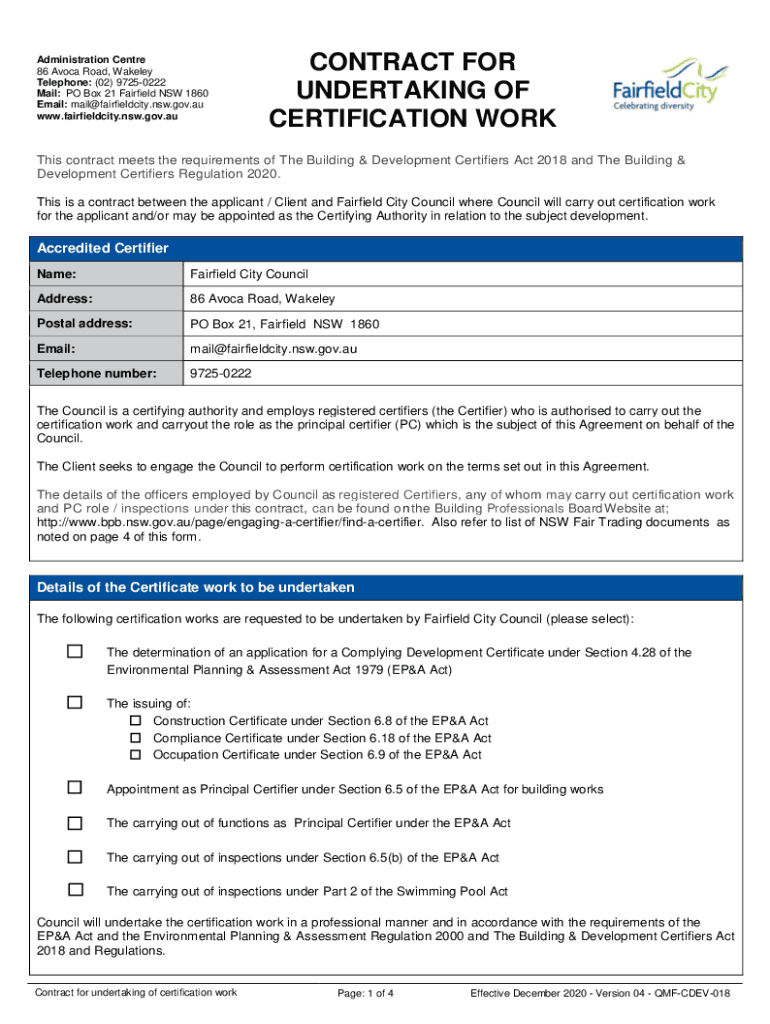 Administration Center 86 Avoid Road, Pamela Telephone: (02) 97250222 Mail: PO Box 21 Fairfield NSW 1860 Email: mail@fairfieldcity.nsw.gov.au www.fairfieldcity.nsw.gov.auCONTRACT FOR UNDERTAKING OF