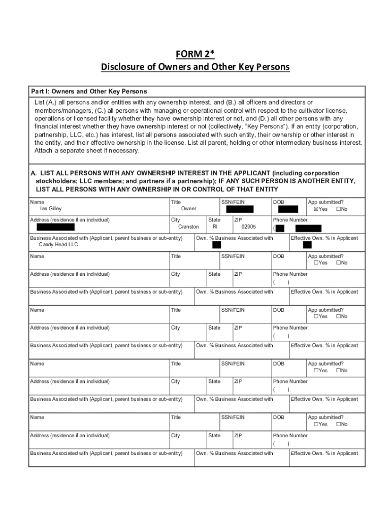 FORM 2* Disclosure of Owners and Other Key Persons Part I: Owners and Other Key Persons List (A.) all persons and/or entities with any ownership interest, and (B.) all officers and directors or members/managers,