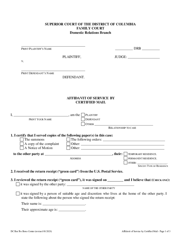 SUPERIOR COURT OF THE DISTRICT OF COLUMBIA FAMILY COURT Domestic Relations Branch ___ ___ DR ___PRINT PLAINTIFFS NAMEPLAINTIFF, JUDGE: ___v. ___ PRINT DEFENDANTS NAMEDEFENDANT.AFFIDAVIT OF SERVICE