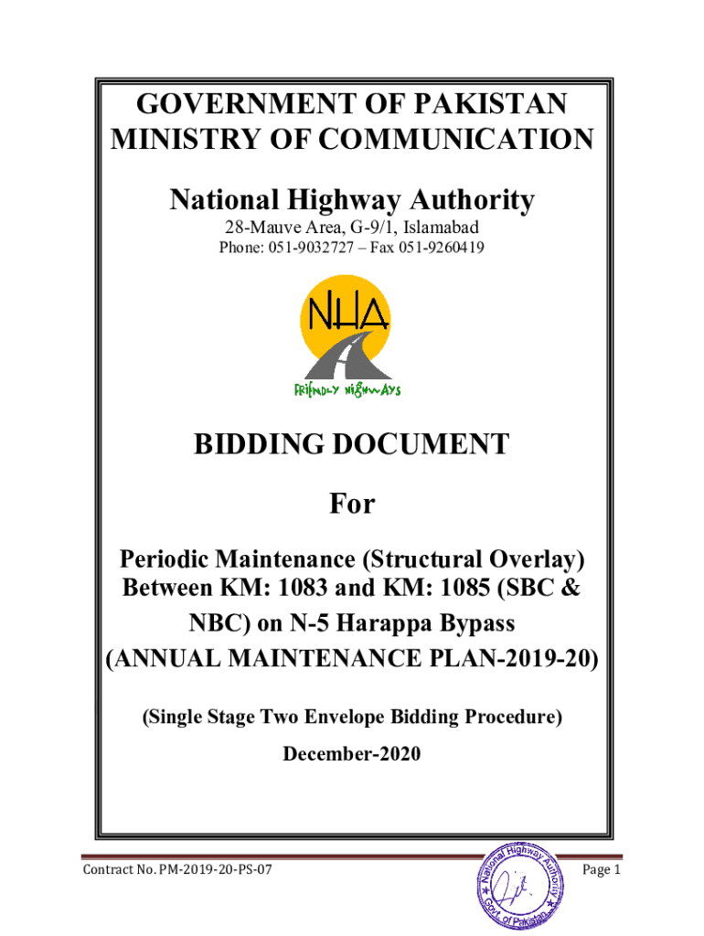 GOVERNMENT OF PAKISTAN MINISTRY OF COMMUNICATION National Highway Authority 28Mauve Area, G9/1, IslamabadPhone: 0519032727 Fax 0519260419BIDDING DOCUMENT For Periodic Maintenance (Structural Overlay)