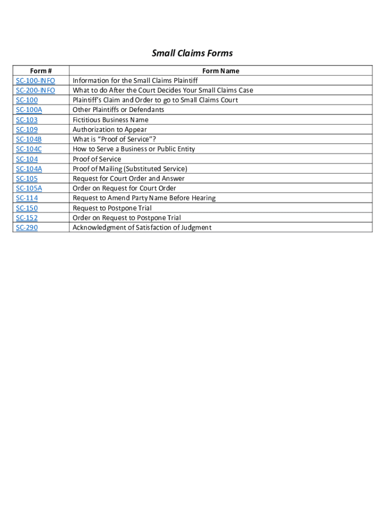 Small Claims Forms Form # SC100INFO SC200INFO SC100 SC100A SC103 SC109 SC104B SC104C SC104 SC104A SC105 SC105A SC114 SC150 SC152 SC290Form Name Information for the Small Claims Plaintiff What to do