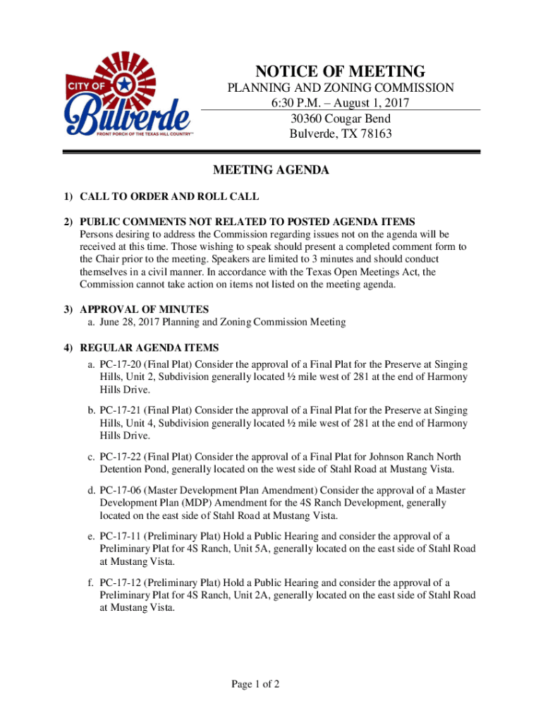 NOTICE OF MEETING PLANNING AND ZONING COMMISSION 6:30 P.M. August 1, 2017 30360 Cougar Bend Valverde, TX 78163 MEETING AGENDA 1) CALL TO ORDER AND ROLL CALL 2) PUBLIC COMMENTS NOT RELATED TO POSTED