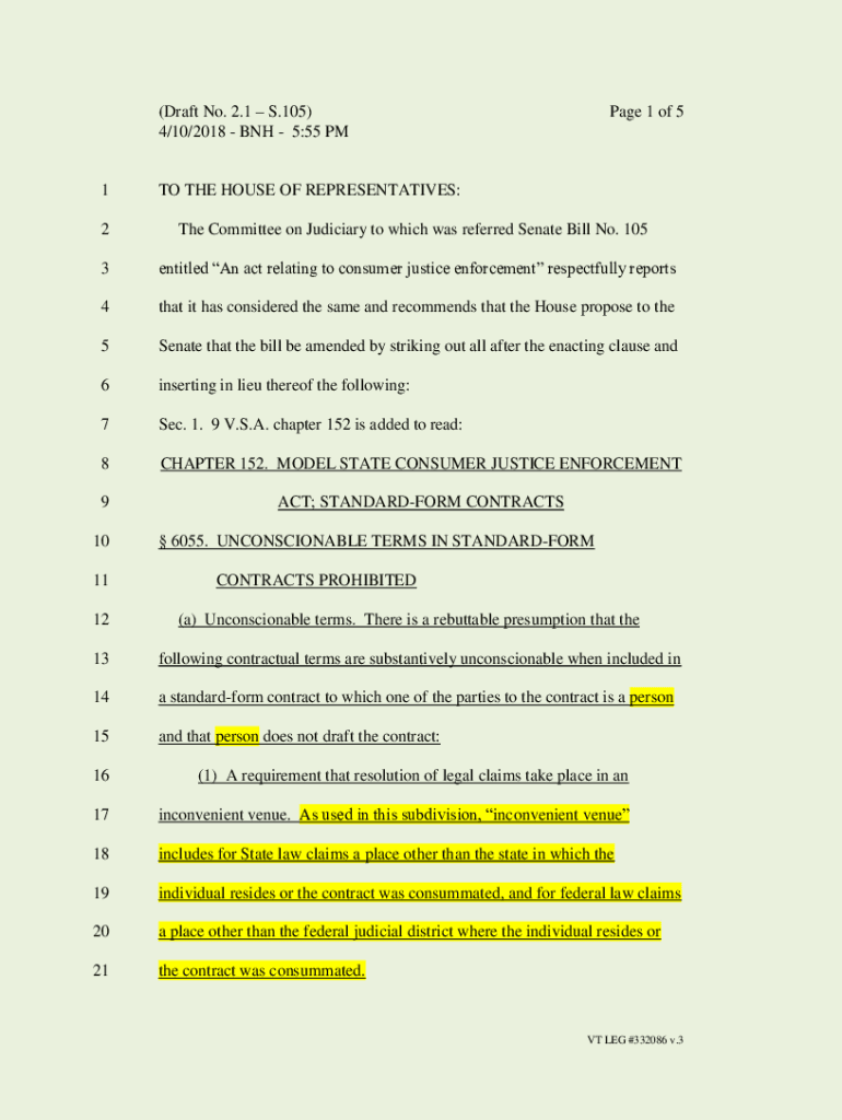 (Draft No. 2.1 S.105) 4/10/2018 BNP 5:55 PM1Page 1 of 5TO THE HOUSE OF REPRESENTATIVES:2The Committee on Judiciary to which was referred Senate Bill No. 1053entitled An act relating to consumer justice