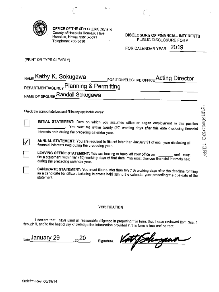(OFFICE OF THE CITY CLERK City and County of Honolulu Hale Honolulu, Hawaii 968133077 Telephone: 7683810DISCLOSURE OF FINANCIAL INTERESTS PUBLIC DISCLOSURE FORM FORCALENDARYEAR2019(PRINT OR TYPE CLEARLY)Kathy