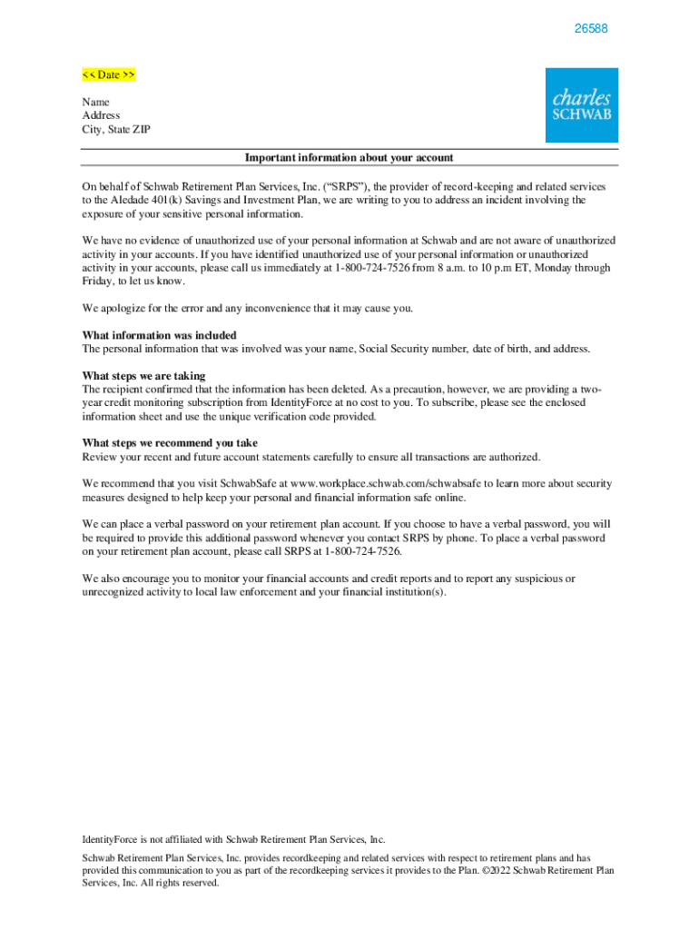 26588 Date Name Address City, State ZIP Important information about your account On behalf of Schwab Retirement Plan Services, Inc. (SRS), the provider of record keeping and related services to the