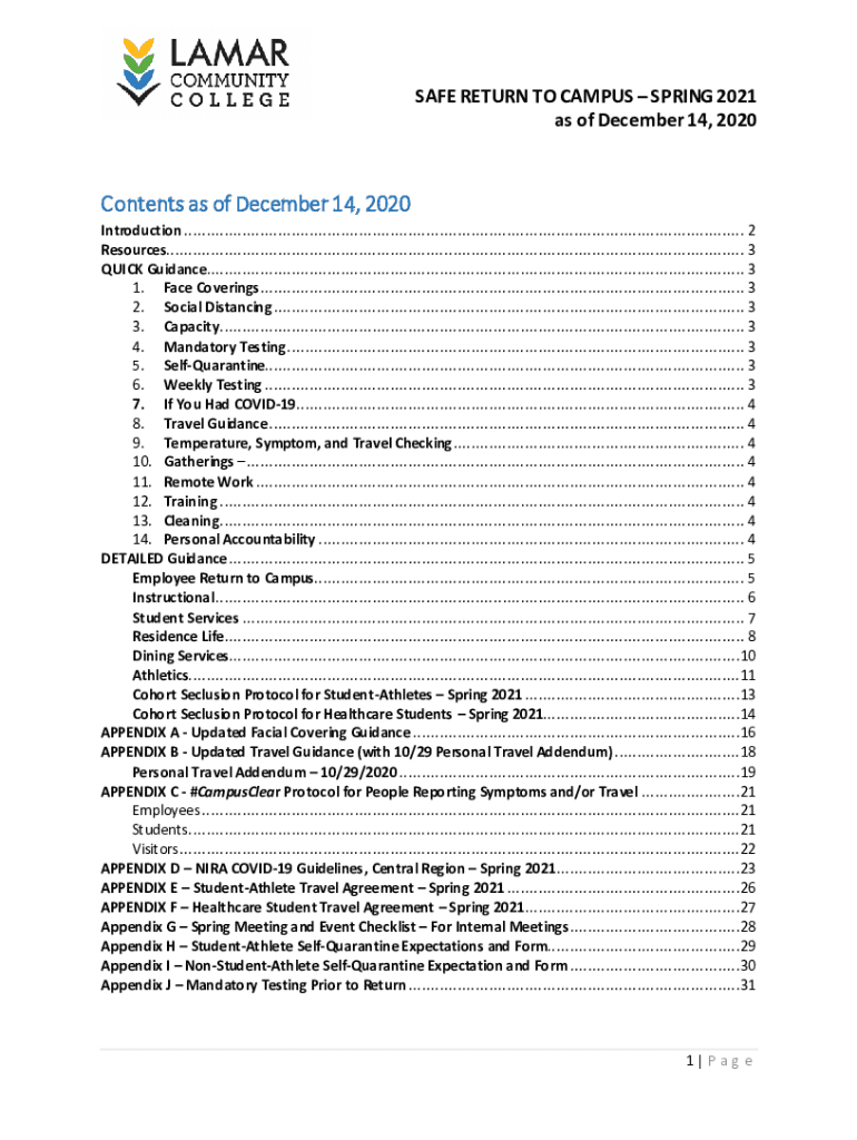 SAFE RETURN TO CAMPUS SPRING 2021 as of December 14, 2020Contents as of December 14, 2020, Introduction .............................................................................................................................