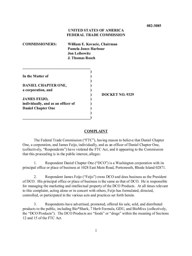0823085UNITED STATES OF AMERICAFEDERAL TRADE COMMISSIONCOMMISSIONERS:William E. Kovacs, Chairman Pamela Jones Harbor Jon Leibniz J. Thomas Bosch___))) DANIEL CHAPTER ONE, ) a corporation, and)) JAMES