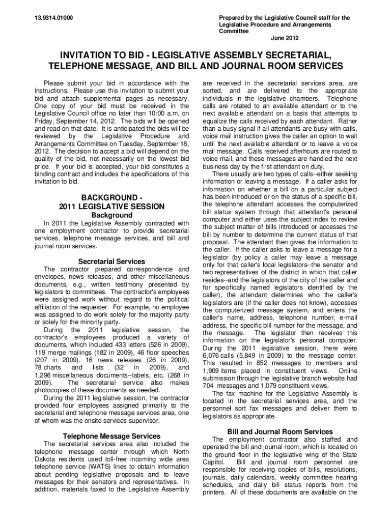 13.9314.01000Prepared by the Legislative Council staff for the Legislative Procedure and Arrangements Committee June 2012INVITATION TO BID LEGISLATIVE ASSEMBLY SECRETARIAL, TELEPHONE MESSAGE, AND