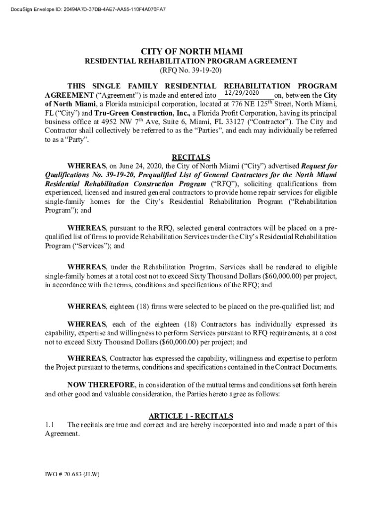 DocuSign Envelope ID: 20494A7D37DB4AE7AA55110F4A070FA7CITY OF NORTH MIAMIRESIDENTIAL REHABILITATION PROGRAM AGREEMENT (RFQ No. 391920) THIS SINGLE FAMILY RESIDENTIAL REHABILITATION PROGRAM 12/29/2020