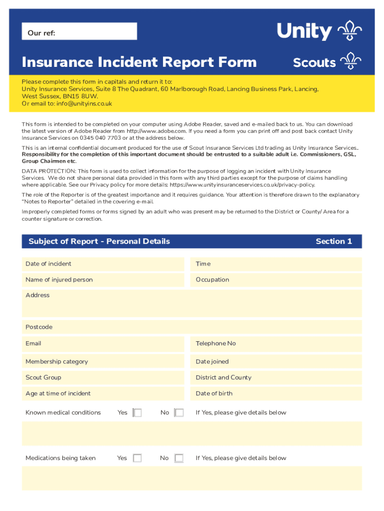 Our ref:Insurance Incident Report Form Please complete this form in capitals and return it to: Unity Insurance Services, Suite 8 The Quadrant, 60 Marlborough Road, Lancing Business Park, Lancing,