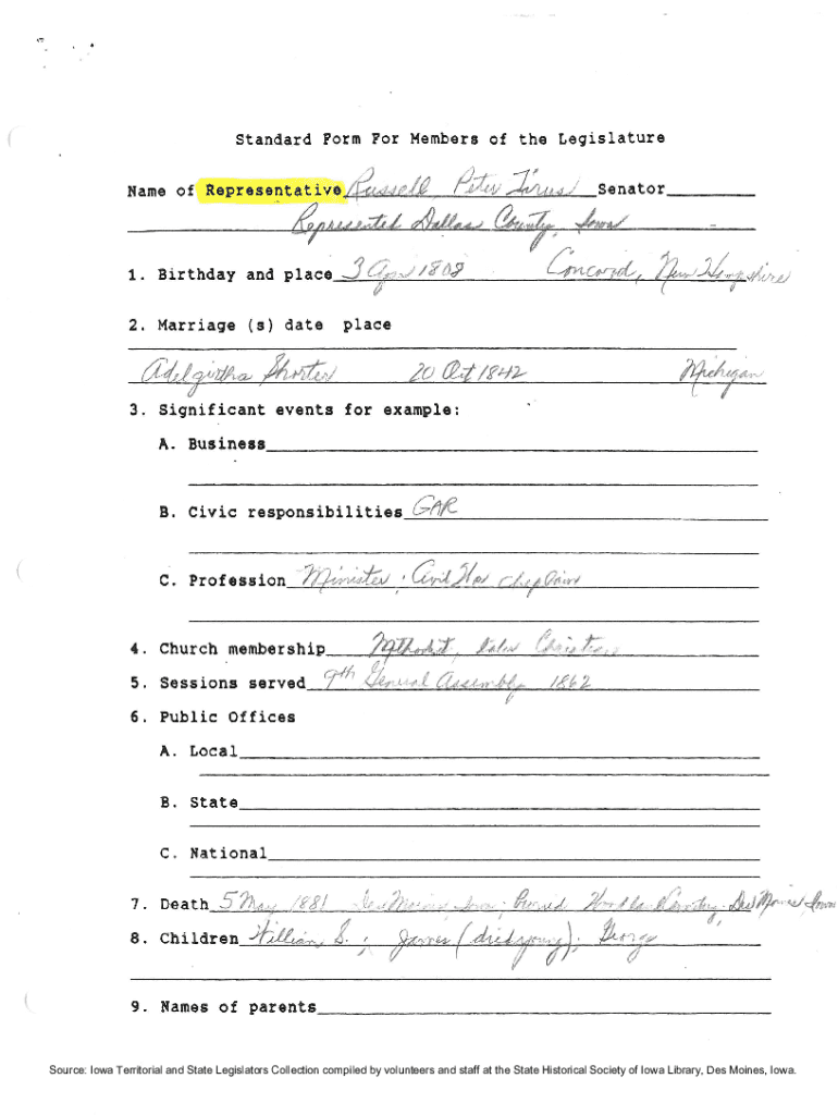 .(Standard Form For Members of the Legislature Name of Representative .44t?./a , f., ;’t,1/.:J:u,4.l.o!.’t;, L 2. Marriage (s) datefkjSenator _ _ __., k./place3. Significant events for example:IA.