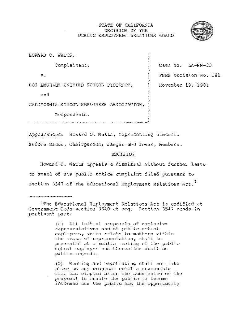 STA\'re OF CALIFORNIA DECISION OF THE PUBLIC EMPLOYMENT RELATIONS BOARDHOWARD O. WATTS, ))Complainant, )Case No.)PER Decision No. 181)November 19, 1981)V LOS ANGELES UNIFIED SCHOOL DISTRICT, and))LAPN33)CALIFORNIA