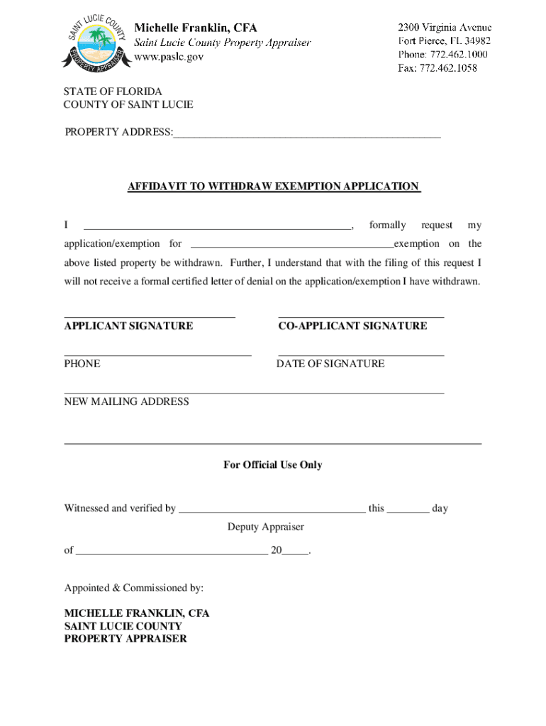 STATE OF FLORIDA COUNTY OF SAINT LUCIE PROPERTY ADDRESS:___AFFIDAVIT TO WITHDRAW EXEMPTION APPLICATION___, formallyrequestmyapplication/exemption for ___exemption on the above listed property be withdrawn.