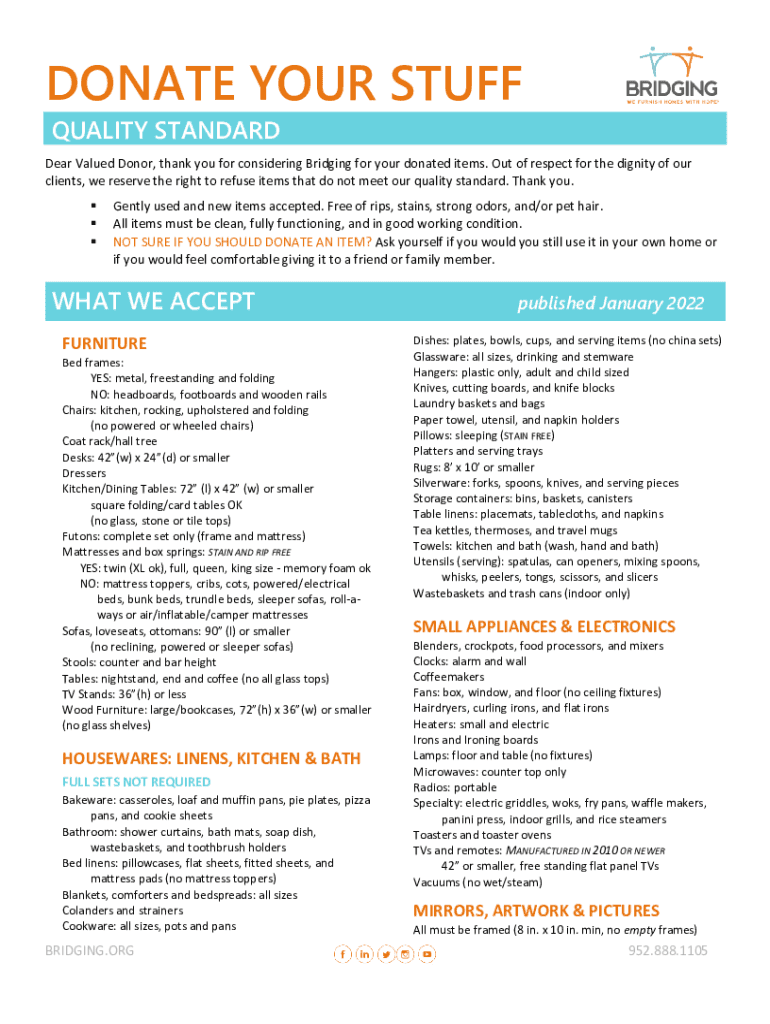 DONATE YOUR STUFF QUALITY STANDARD Dear Valued Donor, thank you for considering Bridging for your donated items. Out of respect for the dignity of our clients, we reserve the right to refuse items