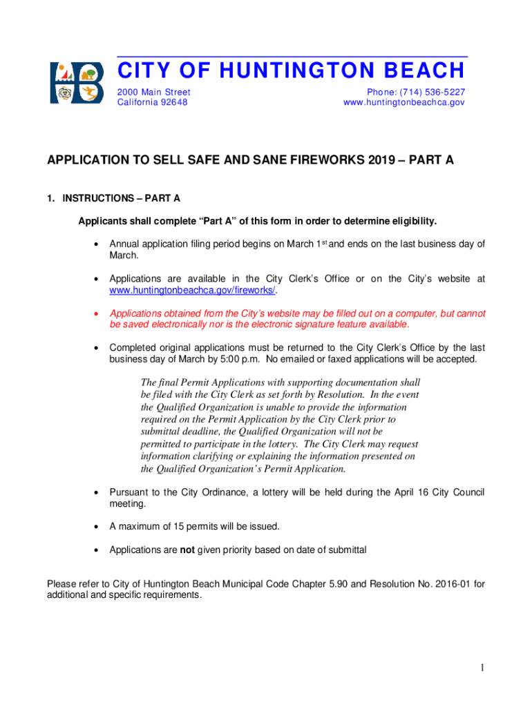 CITY OF HUNTINGTON BEACH 2000 Main Street California 92648Phone: (714) 5365227 www.huntingtonbeachca.govAPPLICATION TO SELL SAFE AND SANE FIREWORKS 2019 PART A 1. INSTRUCTIONS PART A Applicants shall