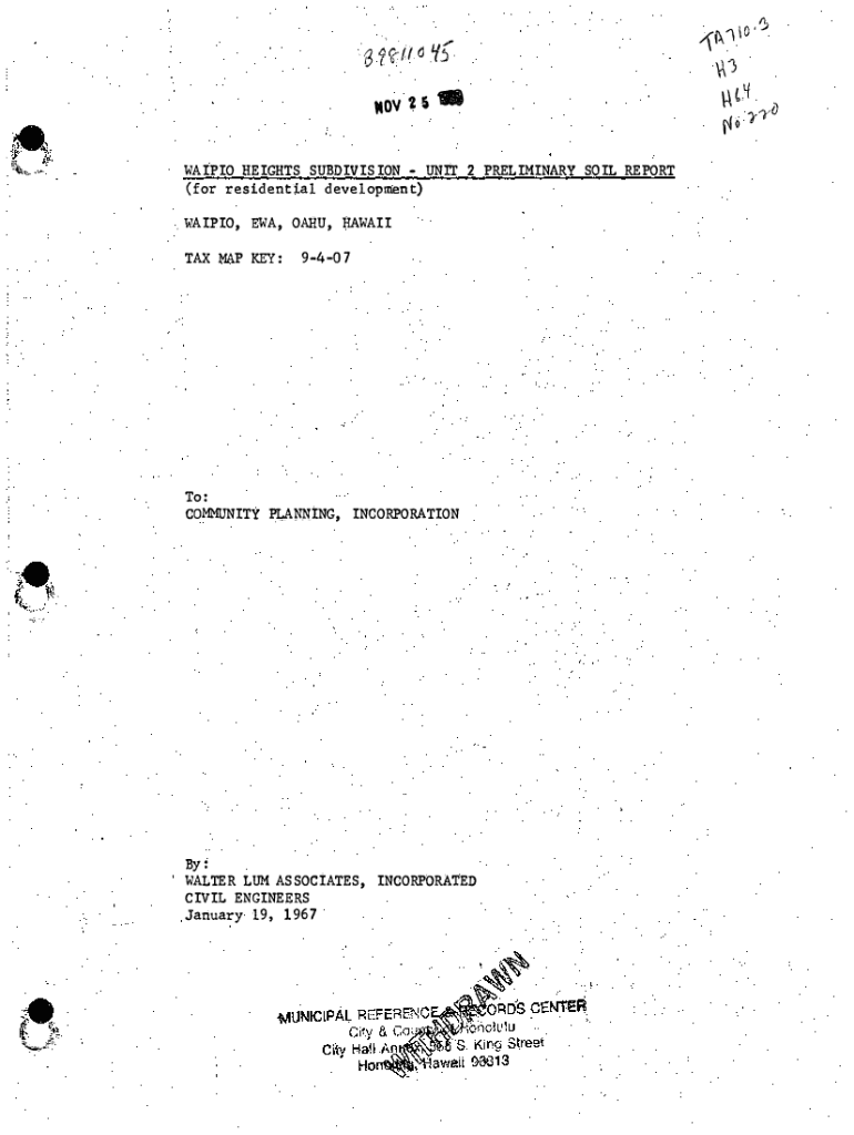 \'MOVE., 1/g y:AA L(:;. ,.!5.,.SCIPIO HEIGHTS SUBDIVISION UNIT 2 PRELIMINARY SOIL REPORT (for residential development). SCIPIO, ERA, OAHU, HAWAIIAN MAP KEY:9407;To: COMMUNITY P4ANNING, INCORPORATION:.a.f