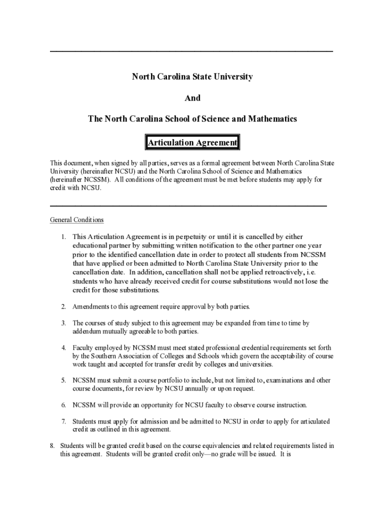 ___ North Carolina State University And The North Carolina School of Science and Mathematics Articulation Agreement This document, when signed by all parties, serves as a formal agreement between