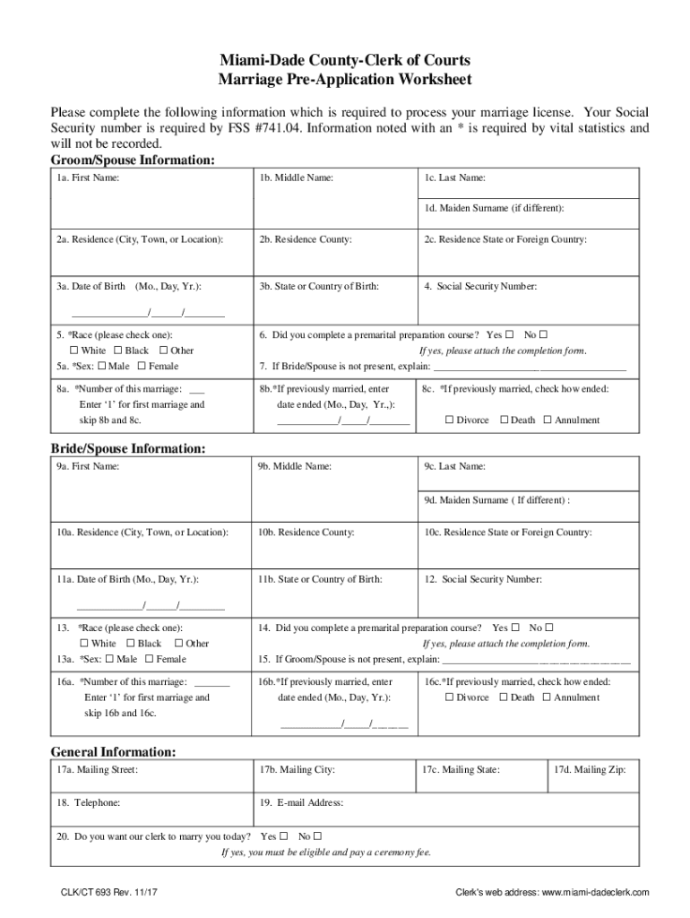 Miami-Dade CountyClerk of Courts Marriage Reapplication Worksheet Please complete the following information which is required to process your marriage license. Your Social Security number is required