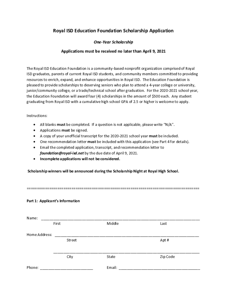 Royal ISD Education Foundation Scholarship Application Boneyard Scholarship Applications must be received no later than April 9, 2021, The Royal ISD Education Foundation is a community based nonprofit