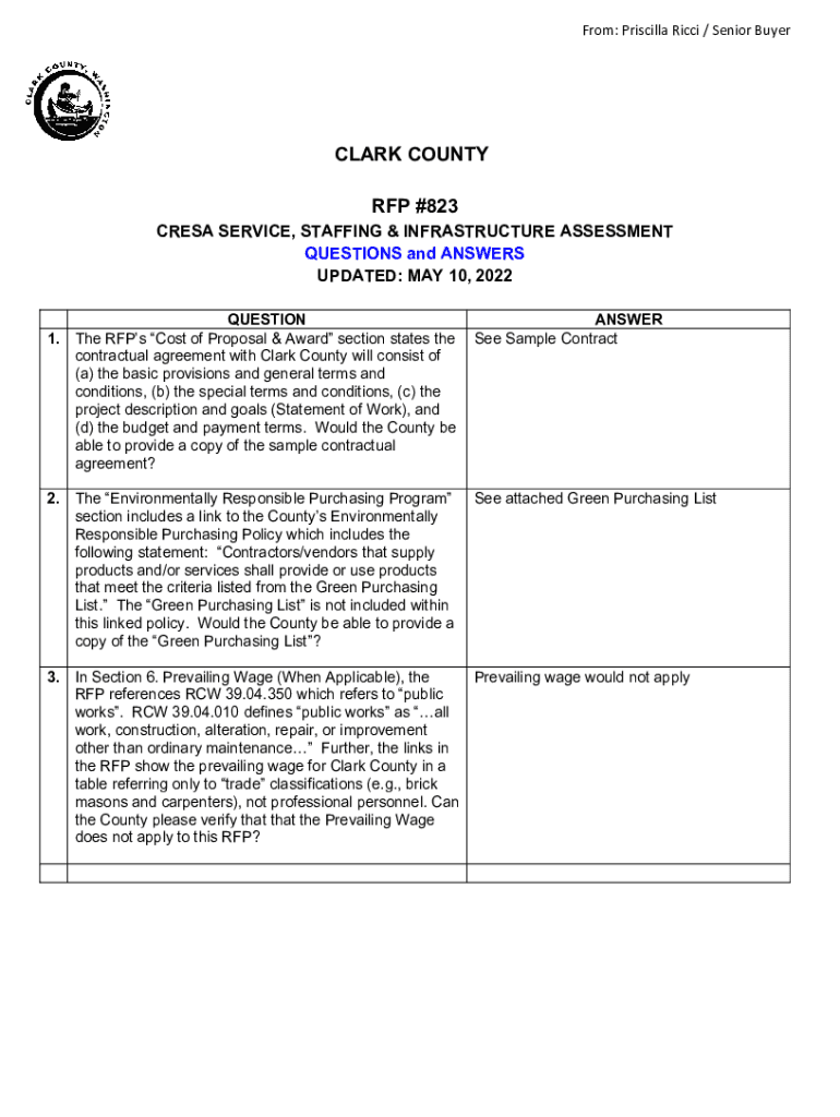 From: Priscilla Rich / Senior BuyerCLARK COUNTY RFP #823CRESA SERVICE, STAFFING & INFRASTRUCTURE ASSESSMENT QUESTIONS and ANSWERS UPDATED: MAY 10, 2022, QUESTION 1. The RFPs Cost of Proposal & Award