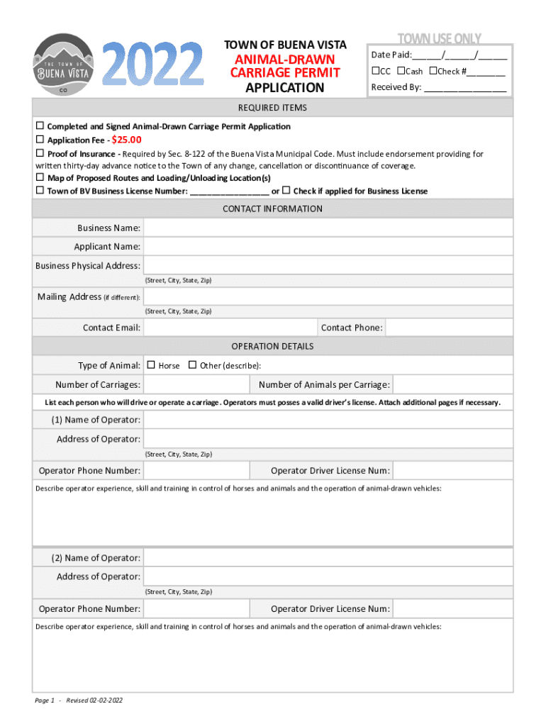 TOWN OF BUENA VISTAANIMALDRAWN CARRIAGE PERMIT APPLICATIONDatePaid:___/___/___ CCCashCheck#___ Received:___REQUIREDITEMSCompleted and Signed AnimalDrawn Carriage Permit Applied on Fee $25.00 Proof
