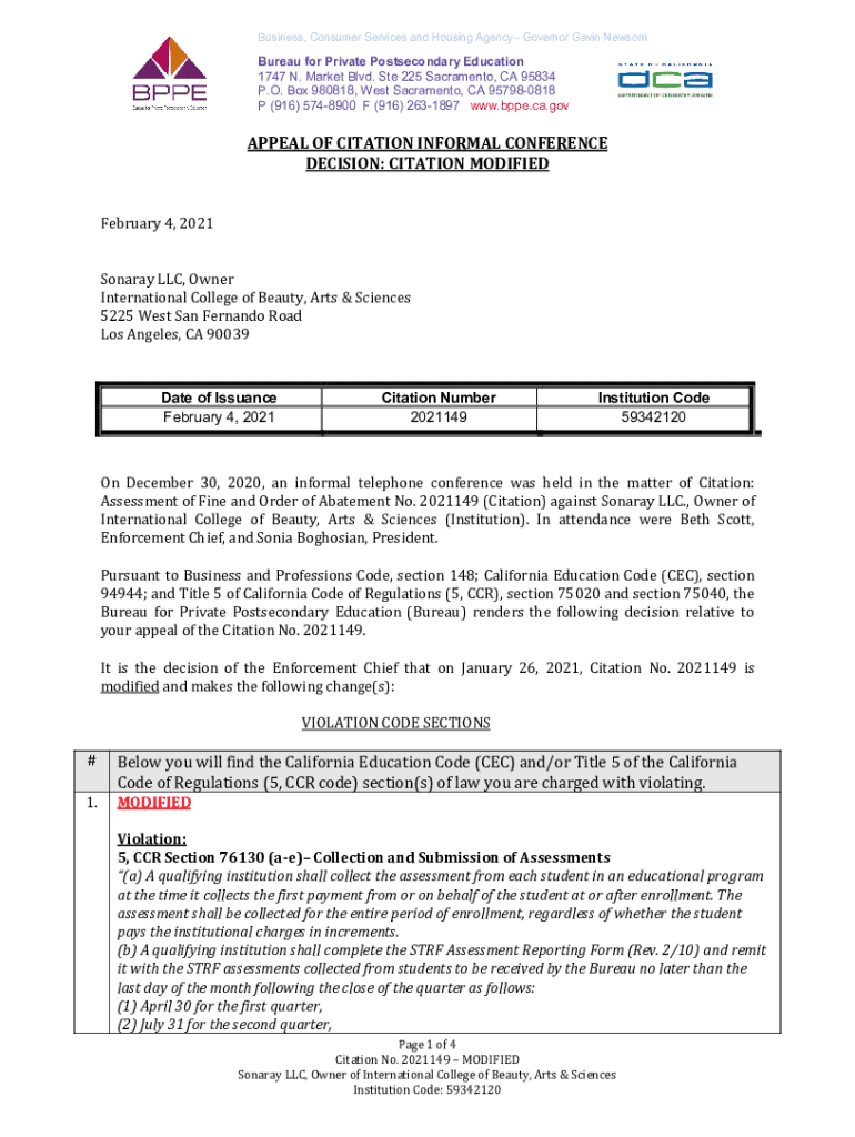 Business, Consumer Services and Housing Agency Governor Gavin NewsomBureau for Private Postsecondary Education 1747 N. Market Blvd. Ste 225 Sacramento, CA 95834 P.O. Box 980818, West Sacramento, CA