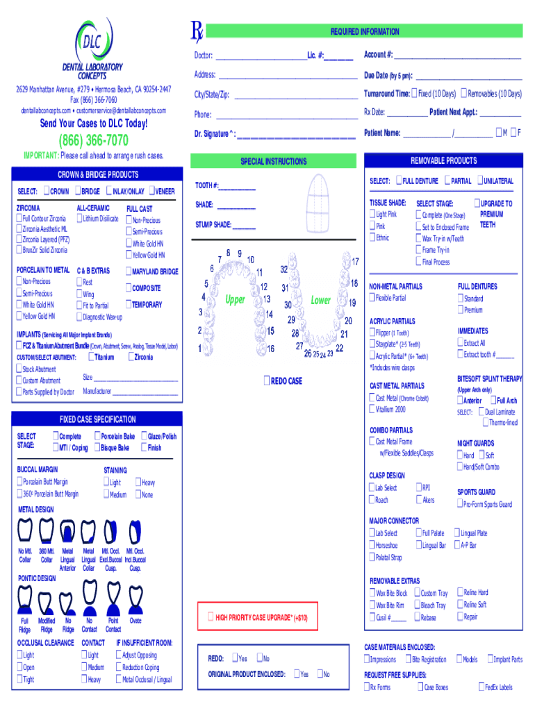 REQUIRED INFORMATION Doctor: ___LIC. #:___Account #: ___Address: ___Due Date (by 5 pm): ___City/State/Zip: ___Turnaround Time: n Fixed (10 Days) n Removable (10 Days)dentallabconcepts.com customerservice@dentallabconcepts.comPhone: