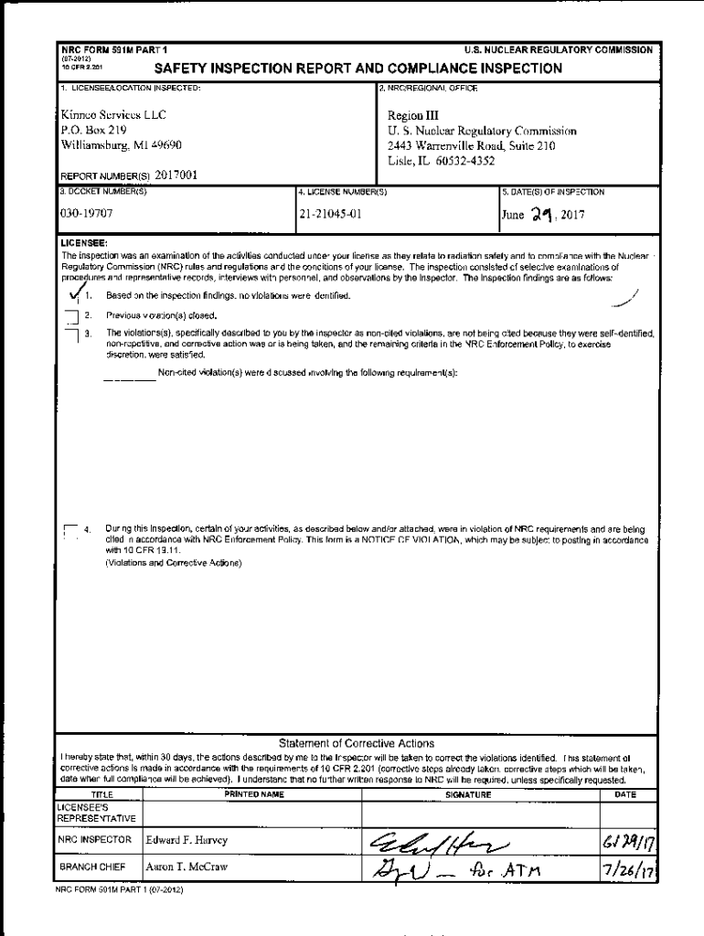 NRC FORM 591M PART 1U. S. NUCLEAR REGULATORY COMMISSION(072012)SAFETY INSPECTION REPORT AND COMPLIANCE INSPECTION1ocFR2.2o11. LICENSEE/LOCATION INSPECTED:2. NRC/REGIONAL OFFICEKinnco Services LLC