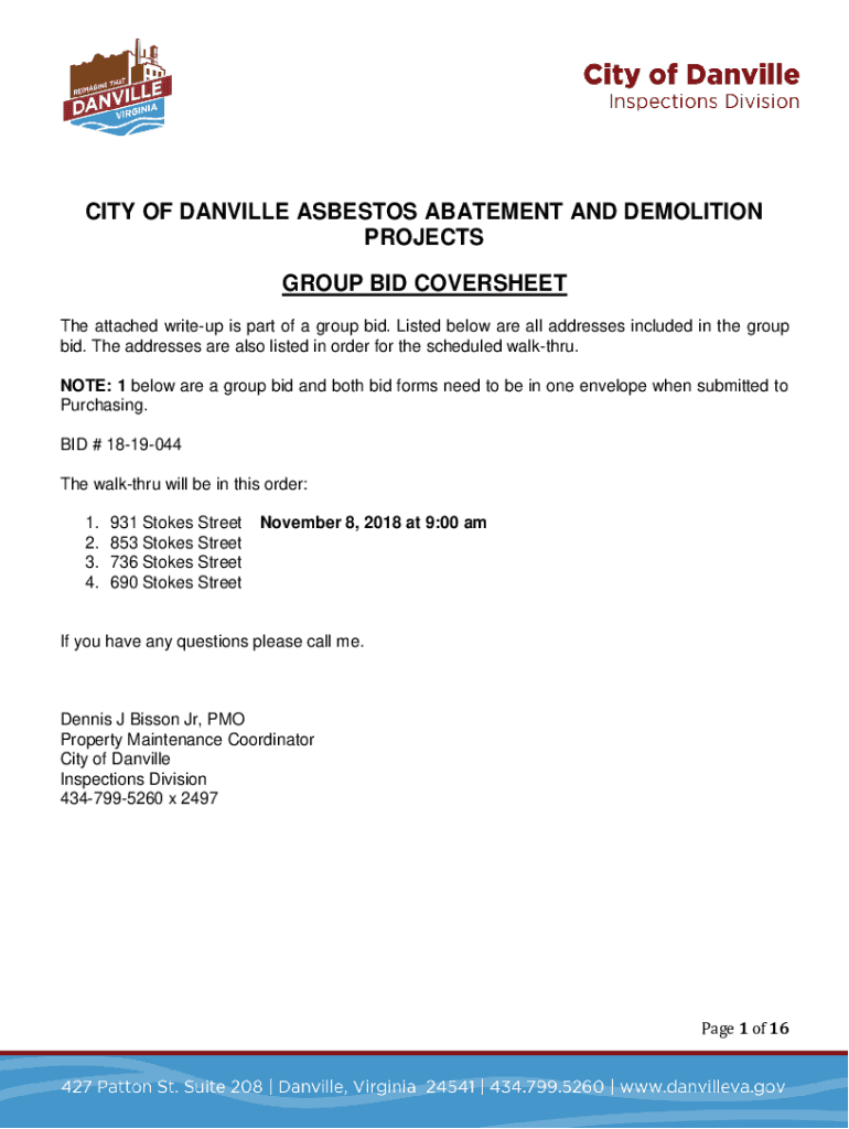 CITY OF DANVILLE ASBESTOS ABATEMENT AND DEMOLITION PROJECTS GROUP BID OVERSEE The attached write-up is part of a group bid. Listed below are all addresses included in the group bid. The addresses