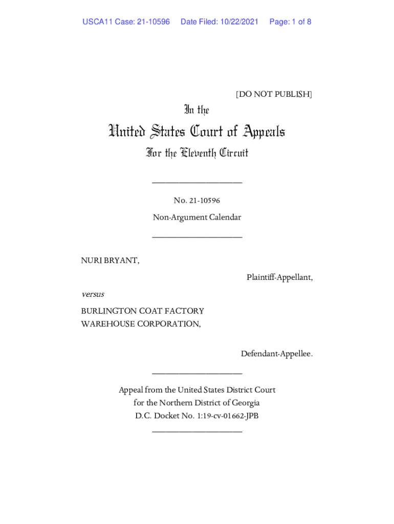 USCA11 Case: 2110596Date Filed: 10/22/2021Page: 1 of 8[DO NOT PUBLISH]In reunited States Court of Appeals For the Eleventh Circuit ___ No. 2110596 Argument Calendar ___ YURI BRYANT, PlaintiffAppellant,